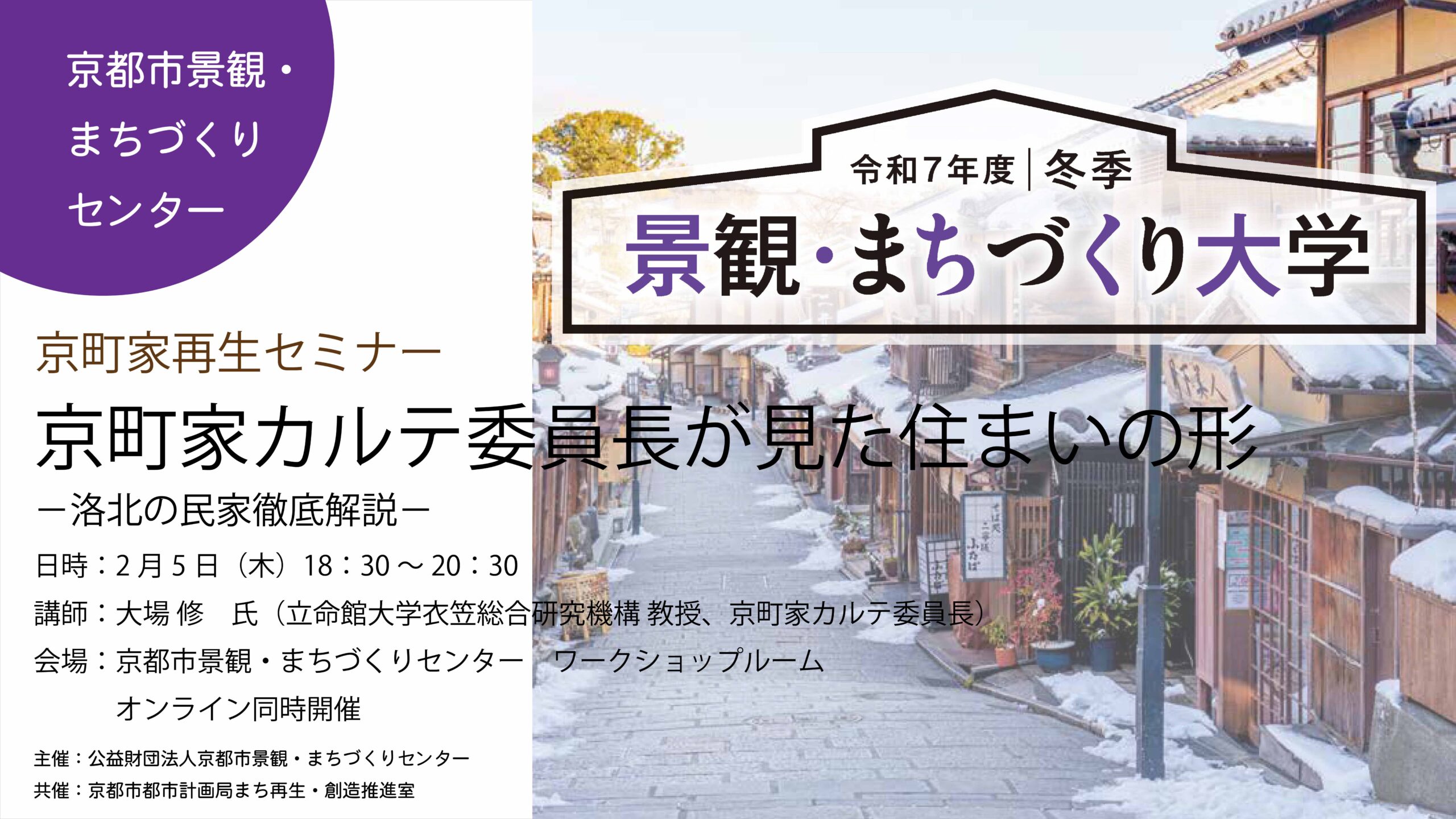 | 開催場所 | 京都市景観・まちづくりセンター ワークショップルーム ※会場での参加が難しい方は、オンライン(Zoom)にて受講することができます。 |
